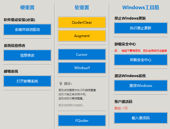 硬重置会修改计算机名称和机器码来解除软件对物理机的标记,使用者应充分了解此功能的目的再考虑是否使用!